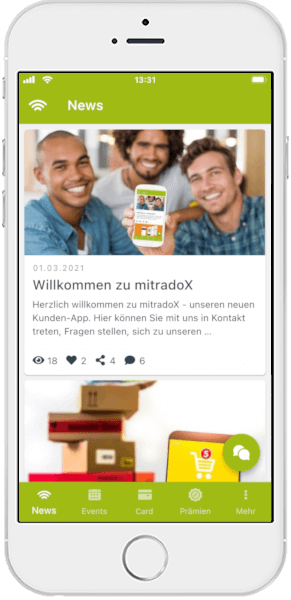 Ihre News ohne Streuverlust auf das Handy ihrer Kunden – das ist der Newsfeed bei mitradoX. Werben Sie für ihre Produkte und Leistungen oder informieren Sie ihre Kunden über Events und Neuigkeiten rund um ihr Unternehmen. Langfristig geplant oder sofort kommuniziert. An alle Kunden oder an eine ausgewählte Gruppe.