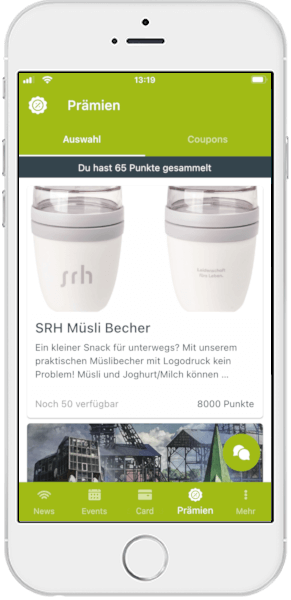 Ihre Kunden sehen in ihrer digitalen Kundenkarte jederzeit, wie viele Punkte sie schon gesammelt haben und welche Prämien sie dafür erhalten. Im Prämienshop der App sind die Prämien dann übersichtlich angeordnet. Das Einlösen selbst ist mit einem Klick gemacht. Ihr Kunde aktiviert einen Gutschein oder Coupon in der App, der dann stationär (z.B. an der Kasse oder im Studierendensekretariat) entwertet wird. Das Geschenk kann er dann direkt mitnehmen.