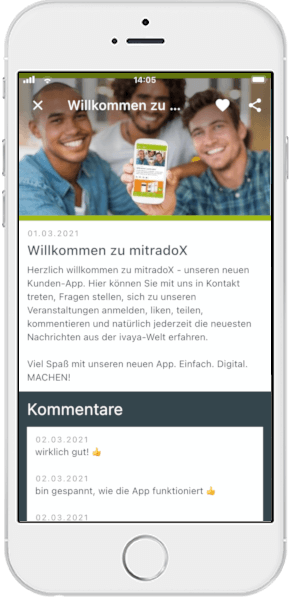 Wir Menschen lieben es zu liken, teilen und kommentieren. Wir klicken bei Facebook, Instagram und TikTok auf die Schaltfläche „gefällt mir“, um einen Beitrag positiv zu bewerten. Wir drücken damit aus, was wir mögen oder was uns wichtig ist. Das haben wir uns bei mitradoX zunutze gemacht. Ihre Kommunikation erfolgt in der App nicht einseitig, sondern in beide Richtungen – ähnlich einem Dialog. Dafür sorgen die Buttons “liken”, “teilen” und “kommentieren”. Ihre Kunden können so auf ihre News reagieren. Sie fühlen sich dadurch abgeholt und wertgeschätzt. Und: je mehr “likes” oder Kommentare eine Nachricht erhält, desto interessanter erscheint sie für andere Leser und desto häufiger wird sie gelesen. Ihre Community wächst. Jede Aktion kann belohnt werden. Ein Like, ein Klick, ein Kommentar – und schon sammeln ihre Kunden Punkte, die sie dann im Prämienshop einlösen können. Alle Reaktionen sehen Sie übersichtlich im Backend. So wissen Sie immer, welche News gut ankommt und welche verbessert werden können.Events