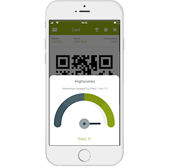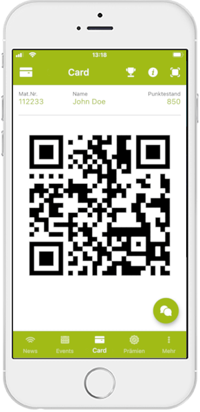 Die digitale Kundenkarte ist der individuelle Fingerabdruck. Hier werden alle wichtigen Daten in einem QR-Code gespeichert. Die Karte wird in der App in einem extra Tab abgebildet und ist jederzeit abrufbar. Ihre Kunden sehen nicht nur den QR-Code, der sich regelmäßig verändert, sondern auch auf einen Blick, auf welchem Platz im Ranking sie sind und wie viele Bonuspunkte es pro Aktion gibt.